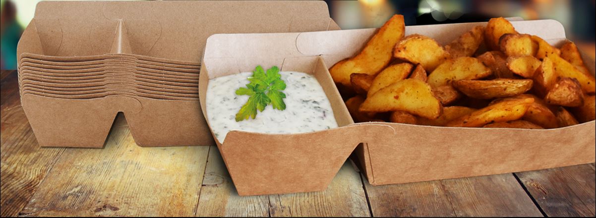 Smeđa kartonska posudica dvodjelna odlična je za pommes frites ili kobasice te ima posebni odjeljak za umak.